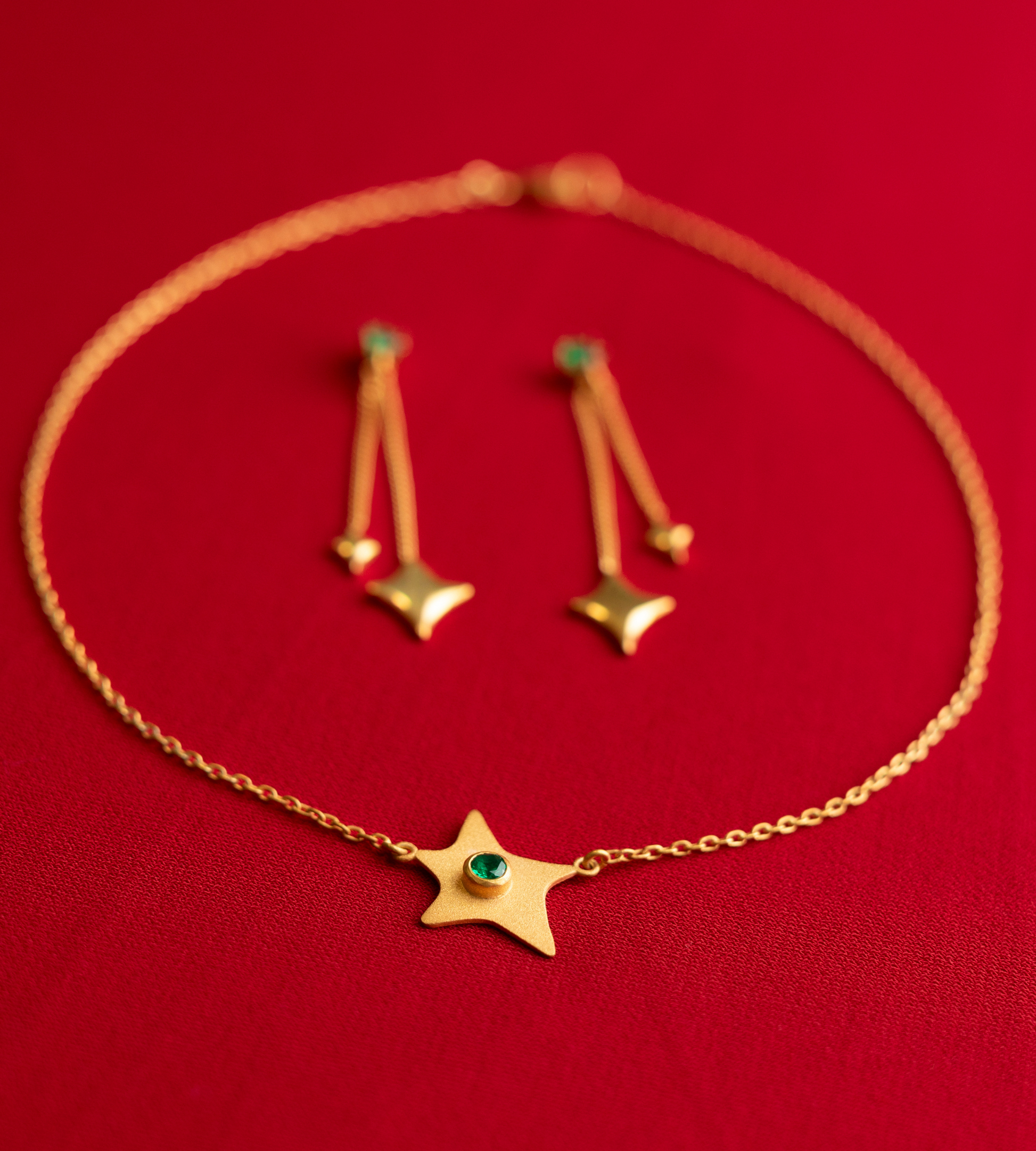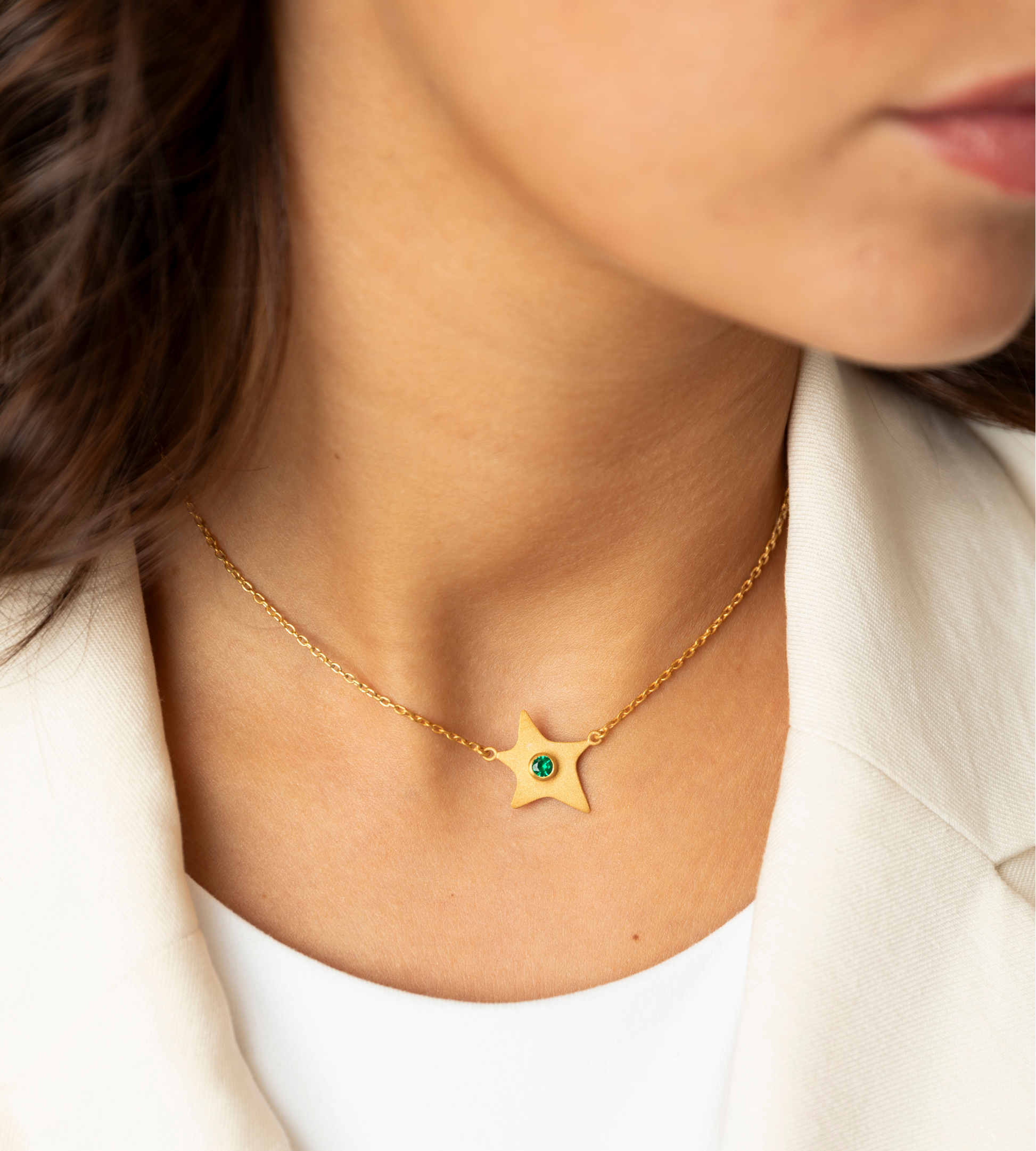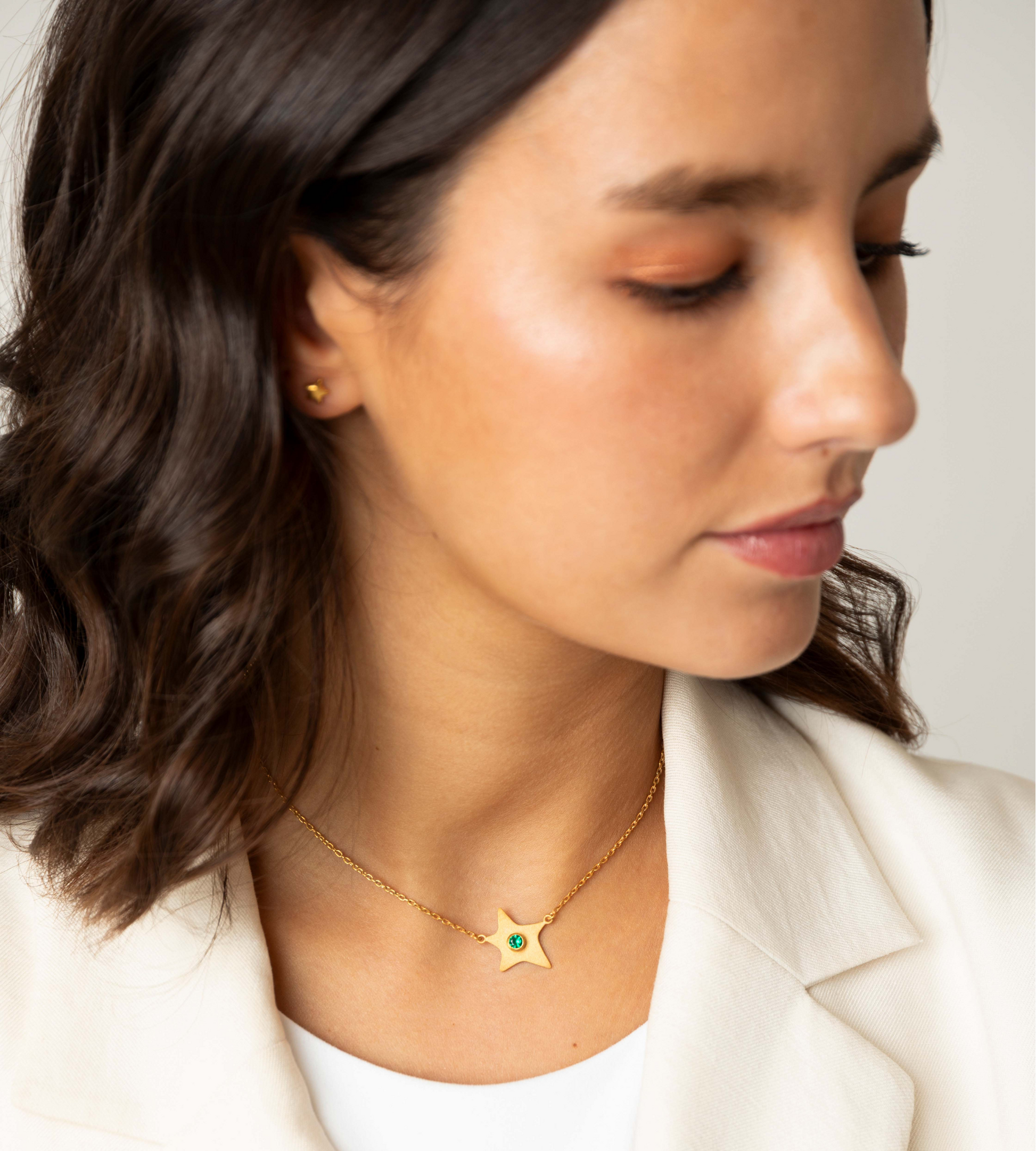 O colar Aquila é uma peça simples e moderna com uma zircónia verde que confere brilho e graciosidade.