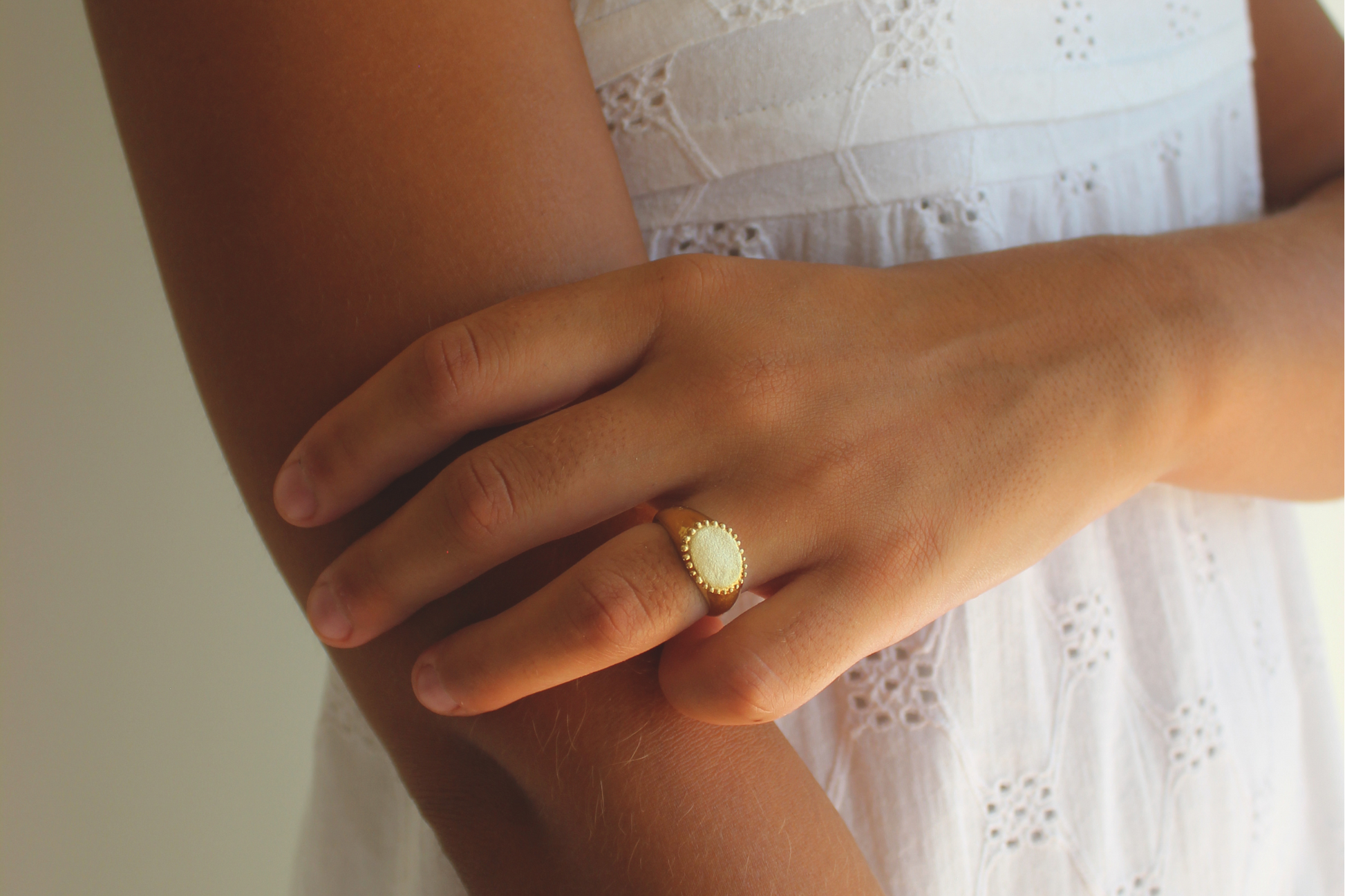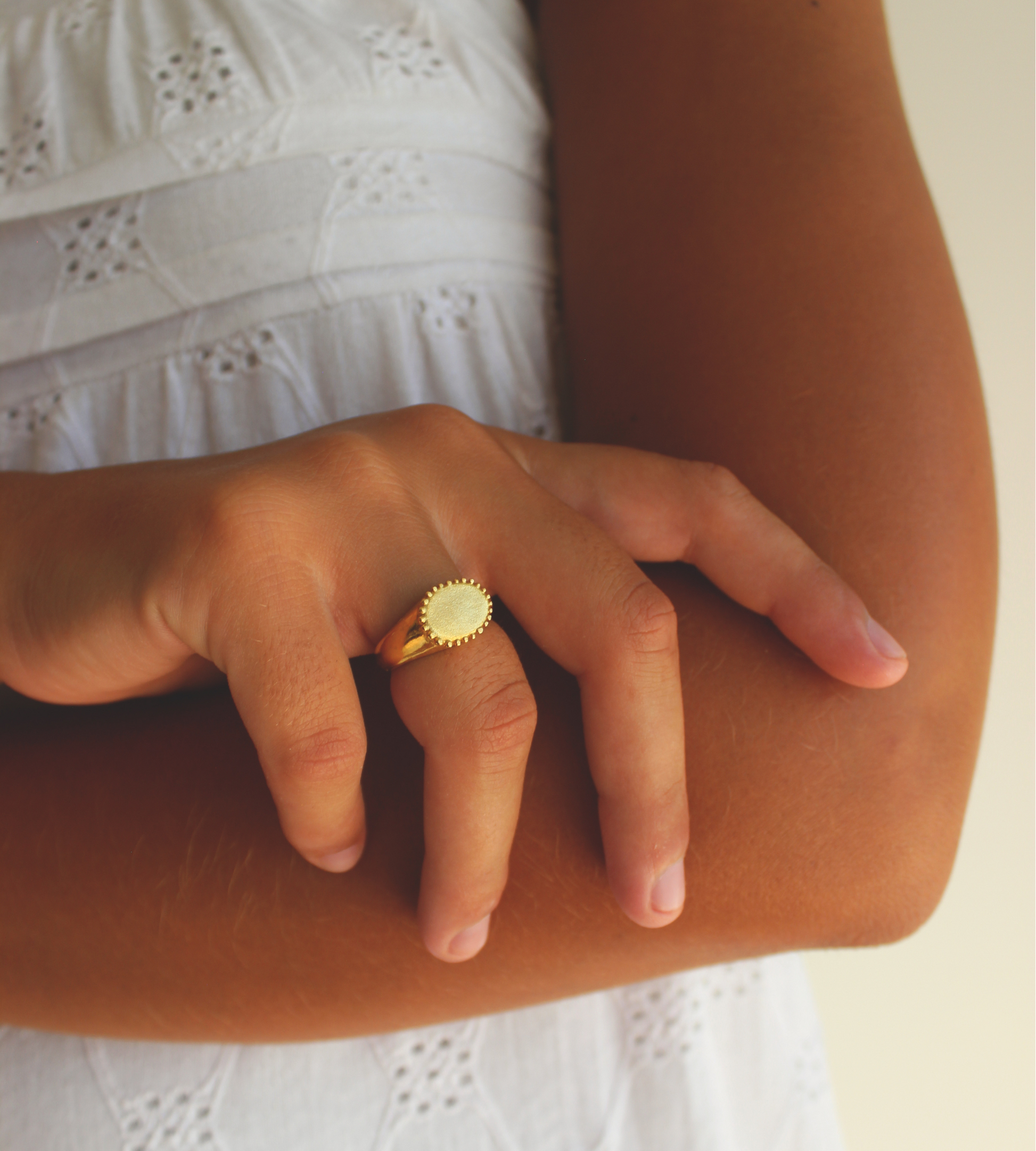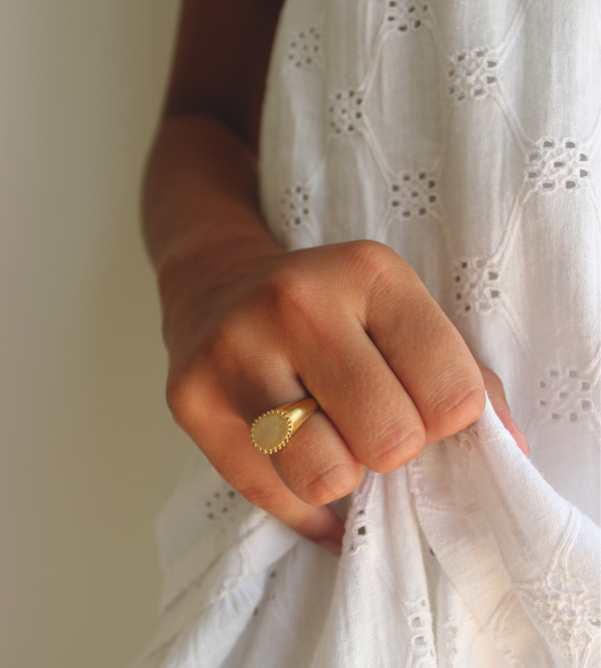 O anel Sophie é um anel de sinete simples de uma elegância muito feminina.